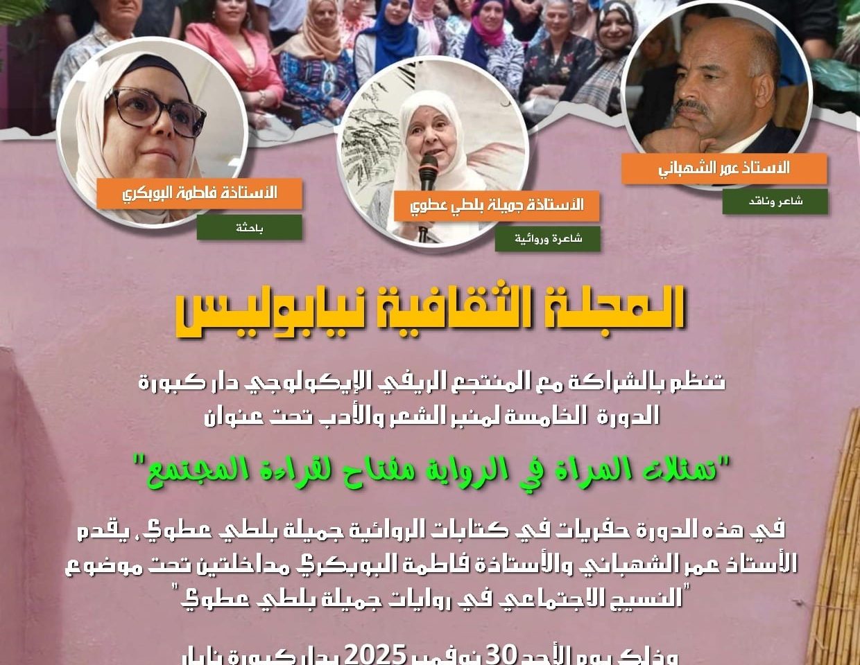 تنظّم #المجلّة_الرقمية_نيابوليس بالشراكة مع بالمنتجع الريفي الإيكولوجي دار كبّورة – نابل الدورة الخامسة “لـ #منبر_الشّعر_والأدب ” تحت عنوان” تمثّلات المرأة في الرواية مفتاح لقراءة المجتمع” وذلك يوم الأحد، 30 نوفمبر2025، ابتداء من الساعة التاسعة صباحا، بدار كبّورة – نابل ، انطلاق الفعاليات على الساعة التاسعة والنصف. ــــــــــــــــــــــــــــــــــ البرنامج العام للدورة الخامسة لمنبر الشعر والأدب: يوم ثقافي بامتياز: – عرض مسرحي للفنان المتميز “نزار الكشو” – تقديم أعمال الروائية والشاعرة جميلة بلطي عطوي محور المداخلات: «النسيج الاجتماعي في روايات جميلة بلطي عطوي» – مداخلة الأستاذ عمر الشهباني الموضوع: «وضعيات نسوية في…